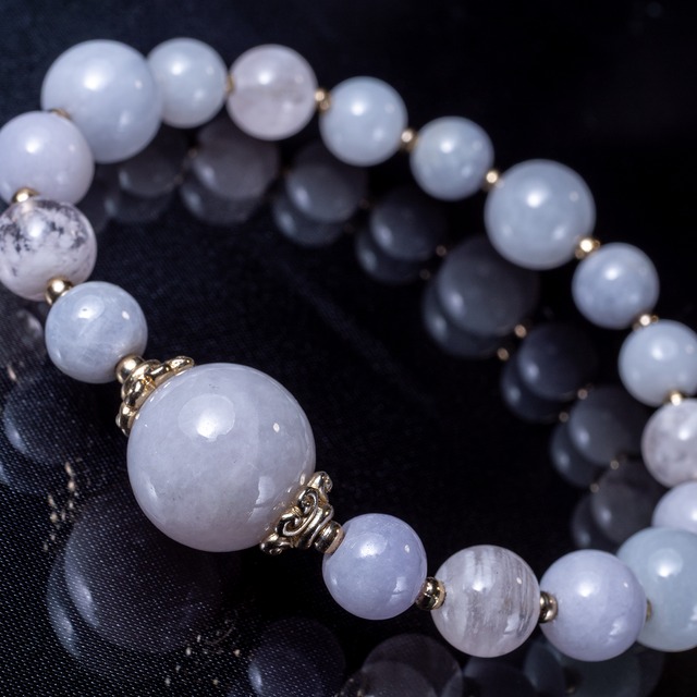 ☆静けさと叡智をまとう、大人のためのヒーリングブレスレット やさしく心を包み込むラベンダー翡翠と、内なる叡智を呼び覚ますセリサイトインクォーツ。 この2つの天然石を組み合わせたブレスレットは、「癒し」と「気づき」を同時に与えてくれる、非常に奥行きのある組み合わせです。 感情を落ち着かせながら、自分の本音や魂の声にそっと耳を傾けたい方におすすめのブレスレットです。 ☆ラベンダー翡翠の効果 ラベンダー翡翠は、翡翠の中でも特に精神性が高い石とされ、以下のような効果が伝えられています。 ・コーヒー深い安心感と心の安定 ・感情の揺れを穏やかに整える ・人間関係の緊張を和らげる ・無条件の愛と自己受容を促す 淡い紫色は、感情の浄化と精神的成長を象徴し、「がんばりすぎてしまう人」の心をそっとほどいてくれる石です。 ☆セリサイトインクォーツの効果 セリサイトインクォーツは、水晶の中に**セリサイト(絹雲母)**を内包した神秘的な天然石。 内面に光を灯すようなエネルギーを持つといわれています。 ・直感力・洞察力を高める ・本質を見抜く力を養う ・思考と感情のバランスを取る ・スピリチュアルな学びのサポート 内包されたセリサイトのきらめきは、気づき・覚醒・精神的な目覚めの象徴。 静かながらも芯の強さを育ててくれる石です。 ☆2つを組み合わせたときの相乗効果 ラベンダー翡翠が「心をゆるめ、守る」 セリサイトインクォーツが「内側の真実を照らす」 この組み合わせは、 ・感情に振り回されずに自分を見つめたい ・優しさと強さを両立したい ・人生の節目で、本当に大切なものを選びたい そんな方にぴったり。 癒されながら、目覚めていく。 静かだけれど、とても成熟したエネルギーを持つブレスレットです。 ☆ラベンダー翡翠13.5mm丸玉×1 ☆ラベンダー翡翠7.5mm丸玉×10 ☆ラベンダー翡翠10mm丸玉×3 ☆セリサイトインクォーツ8mm×4 ☆手首サイズ/16cm