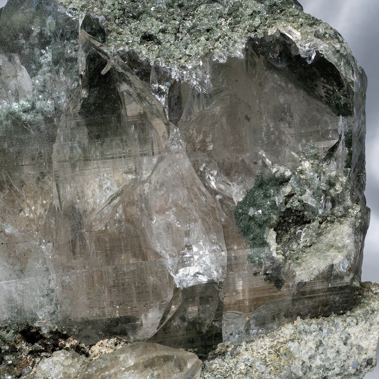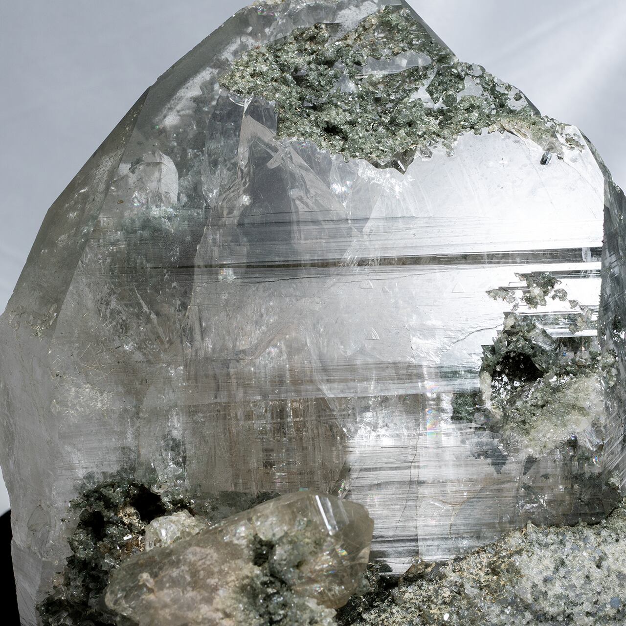 標高5,000メートル以上の山でしか採取出来ないヒマラヤ水晶の特徴であるクローライト(緑泥石)が、水晶の美しさを更に引き出しています。