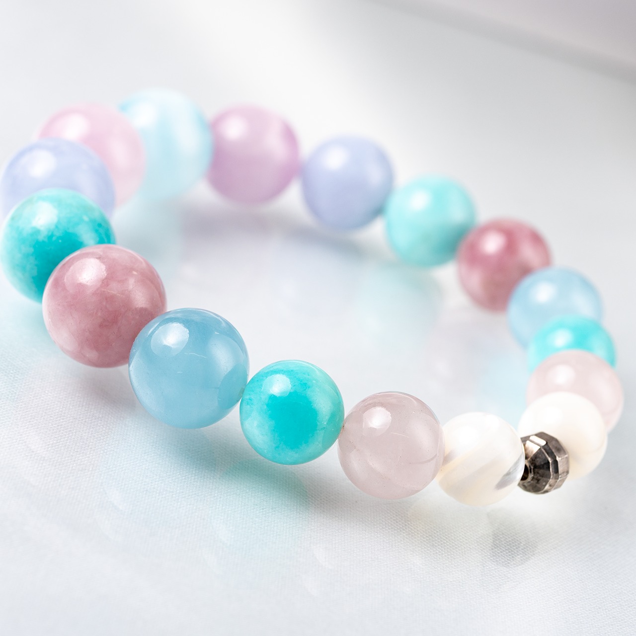 このブレスレットは、まるで南国の海辺で深呼吸をしているような、やさしい色合いと波のようなエネルギーを持っています。