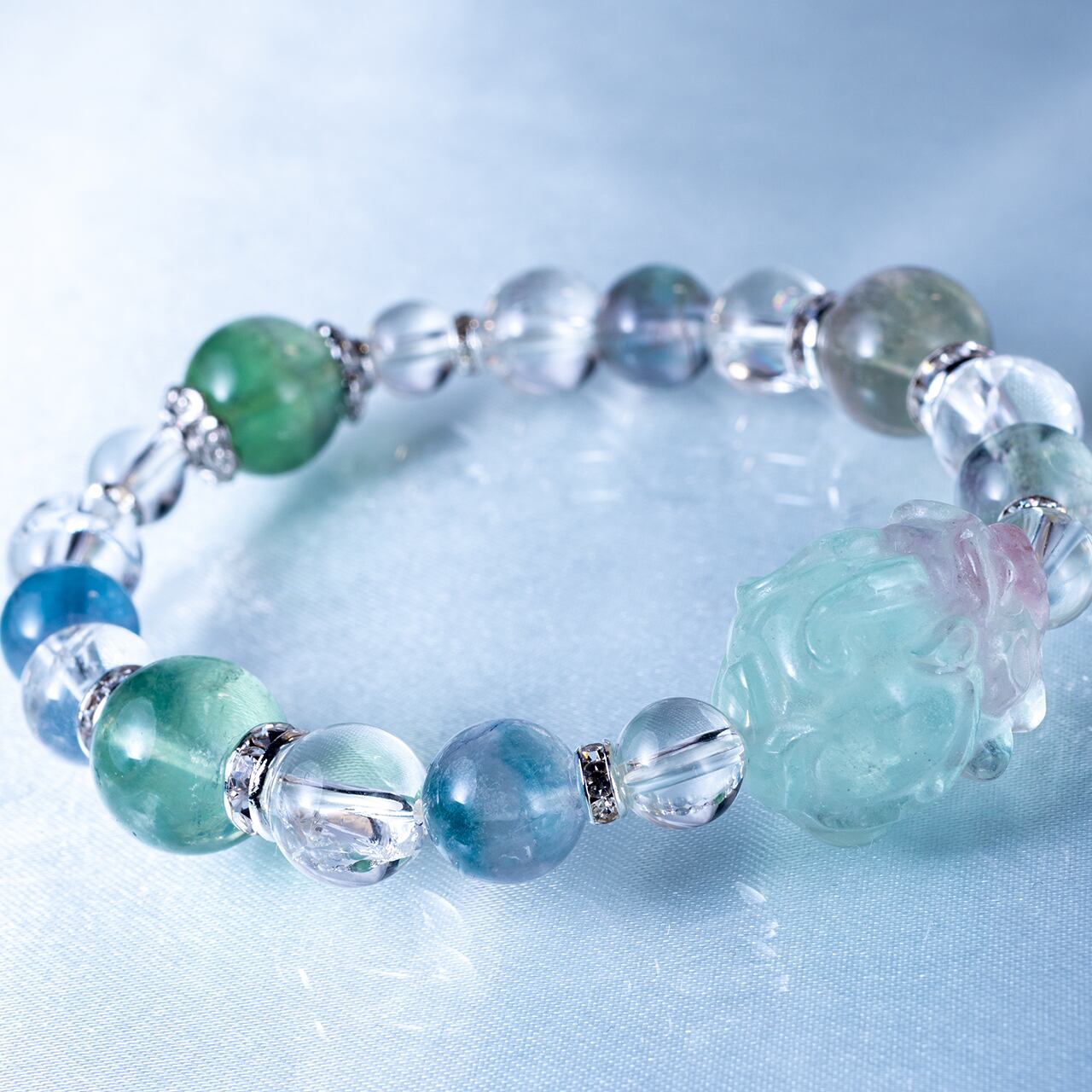 フローライト貔貅・水晶・アイリスクォーツ・フローライトのブレスレットは、「浄化 × 思考整理 × 直感 × 豊かさ」をテーマにしたお守りです。